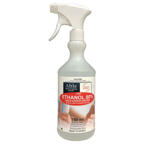 Ethanol 80% is also suitable for use in domestic and commercial settings where soap and water are not readily available. This product may also find use as a hard surface sanitiser providing it is used in well ventilated area free from sources of ignition, trafficable surfaces affected by alcohol.