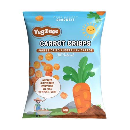 VegEase Carrot Crisps are freeze dried NOT fried made in Australia from Australian ingredients. This pouch is packed with essential nutrients, fibre and antioxidants, Carrots are a good source of beta-carotene, fiber, vitamin K, potassium and antioxidants.