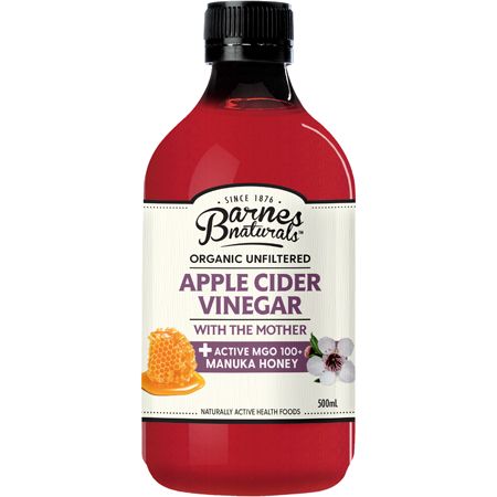 Barnes Naturals Organic Apple Cider Vinegar with Manuka honey brings together our popular Organic Unfiltered Apple Cider Vinegar combined with the super food power of 100% Active MGO100+ Manuka honey.