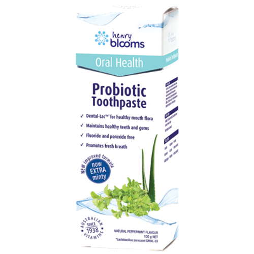 Bring the power of probiotic protection to your mouth with Henry Blooms Probiotic Toothpaste, formulated to effectively clean the teeth and gums and freshen the mouth and breath, with an energising natural Peppermint flavour that will leave your mouth with a minty-fresh feeling you'll love.