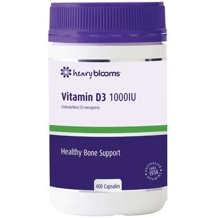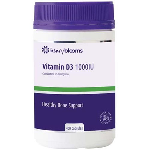 Henry Blooms Vitamin D3 1000IU is a convenient one-a-day capsule providing 25 micrograms of Colecalciferol, an identical form of Vitamin D produced in the body.
