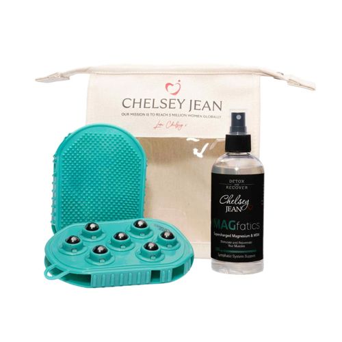 Detox and recover with Chelsey Jean's uniquely formulated MAGfatics Recovery Kit. This kit features the powerful MAGfatics 500ml spray À a super-charged combination of magnesium and MSM, enhanced with lymphatic oils, designed to assist in pain relief, detoxification, muscle recovery, along with Chelsey JeanÀs signature lymphatic massage gloves.