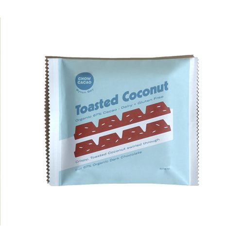 Taking you back to your childhood with crispy toasted coconut swirled through Chow Cacao's 67% Organic dark chocolate.
