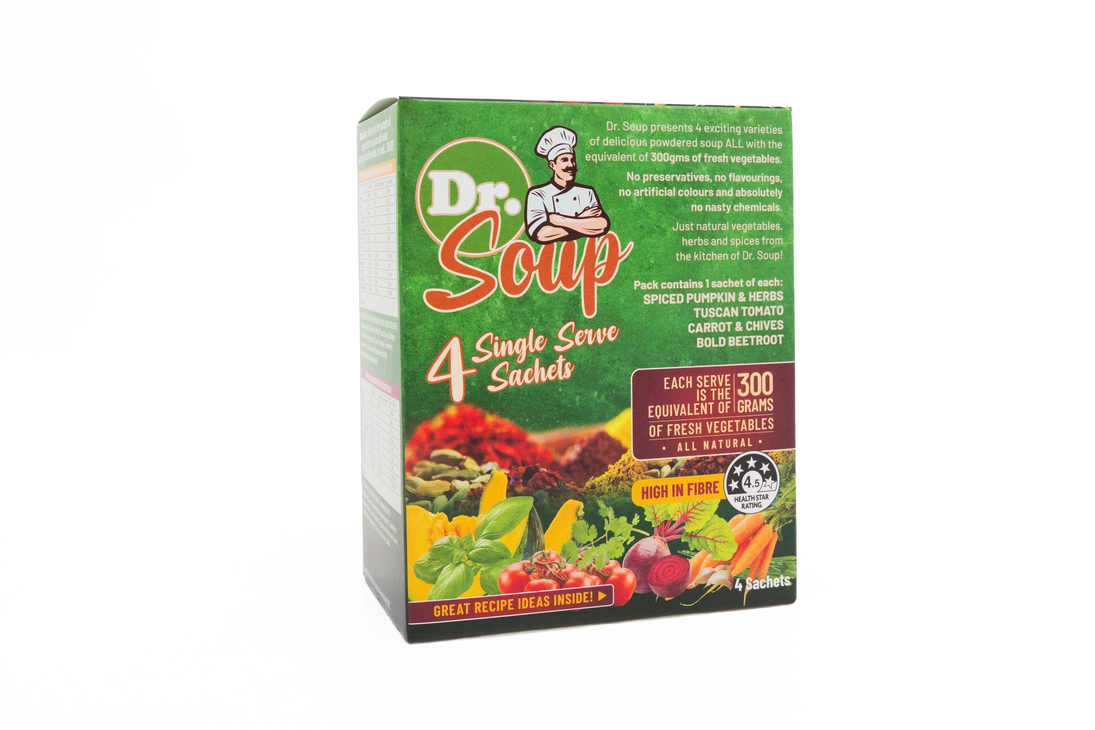 Each of the Dr. Soup® varieties is formulated from a range of dried vegetables, herbs and spices such that each 30 gram powdered serve is equivalent to 300 grams of gresh vegetables. Dr. Soup® has been designed to generously complement the diet, without completely replacing fresh vegetables.