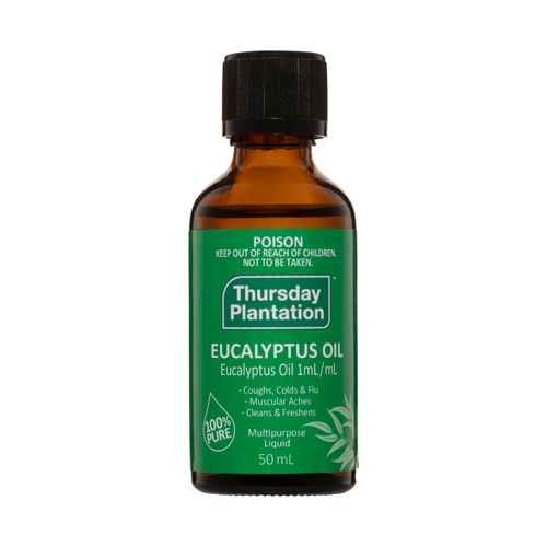 Thursday Plantationˢs Eucalyptus Oil, contains 100% pure Eucalyptus Globulus oil with a high percentage of the Eucalyptol compound which is responsible for the oilˢs clean, sharp, slightly medicinal smell as well as its medicinal value.