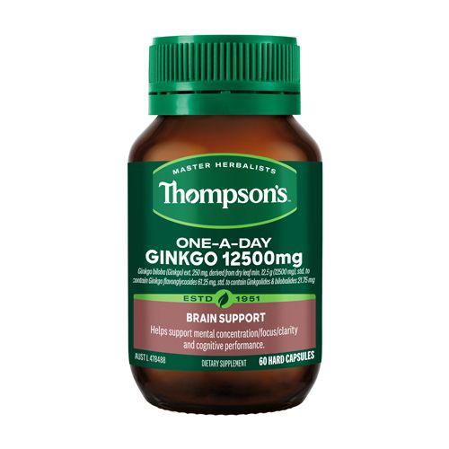 Thompson's One-A-Day Ginkgo 12500mg is formulated for convenience with a one a day dose. It contains ginkgo, a source of antioxidants to help reduce free radical damage to body cells. It is also formulated to: