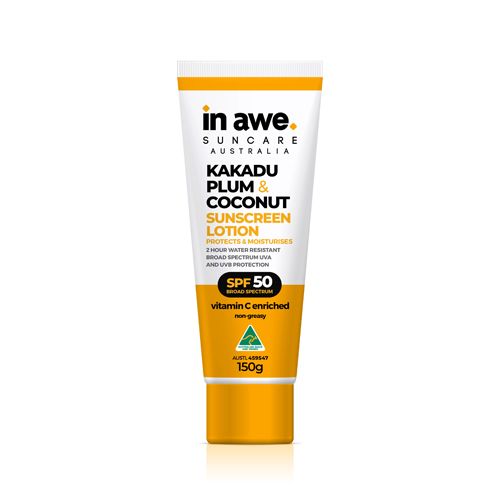 Introducing In Awe's new SPF50 Sunscreen Lotion with Kakadu Plum & Coconut À proudly Australian-made and TGA-approved. Perfect for everyday sun protection, this lightweight and smoother formula combines the power of Kakadu Plum, the worldÀs richest natural source of vitamin C.