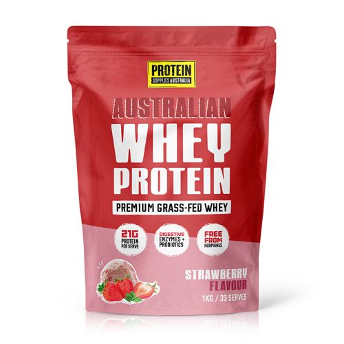 Power up your day with Protein Supplies Australia's Australian Whey Protein Strawberry, made from premium grass-fed Whey Protein right here in Australia. Each serve delivers 21g of clean protein with a smooth strawberry flavour, naturally sweetened with Stevia.