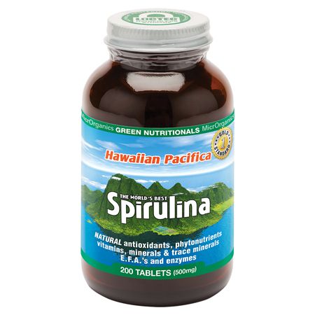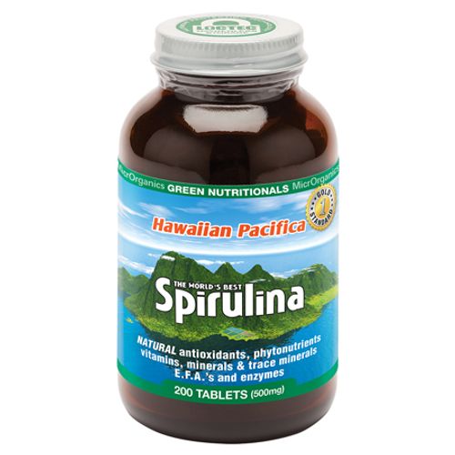 Hawaiian Pacifica Spirulina contains around sixty percent complete, highly digestible protein and contains every essential amino acid. It also contains more beta-carotene than any other whole food. It is the best whole food source of gamma linolenic acid (GLA). It is rich in B vitamins, minerals, trace elements, chlorophyll, and enzymes.