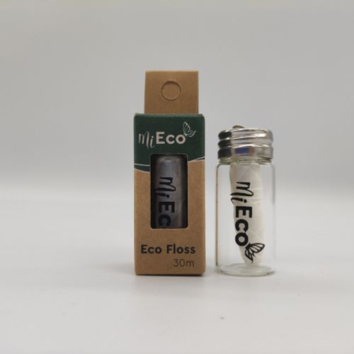 MiEco Dental Floss in a reusable/refillable glass dispenser.