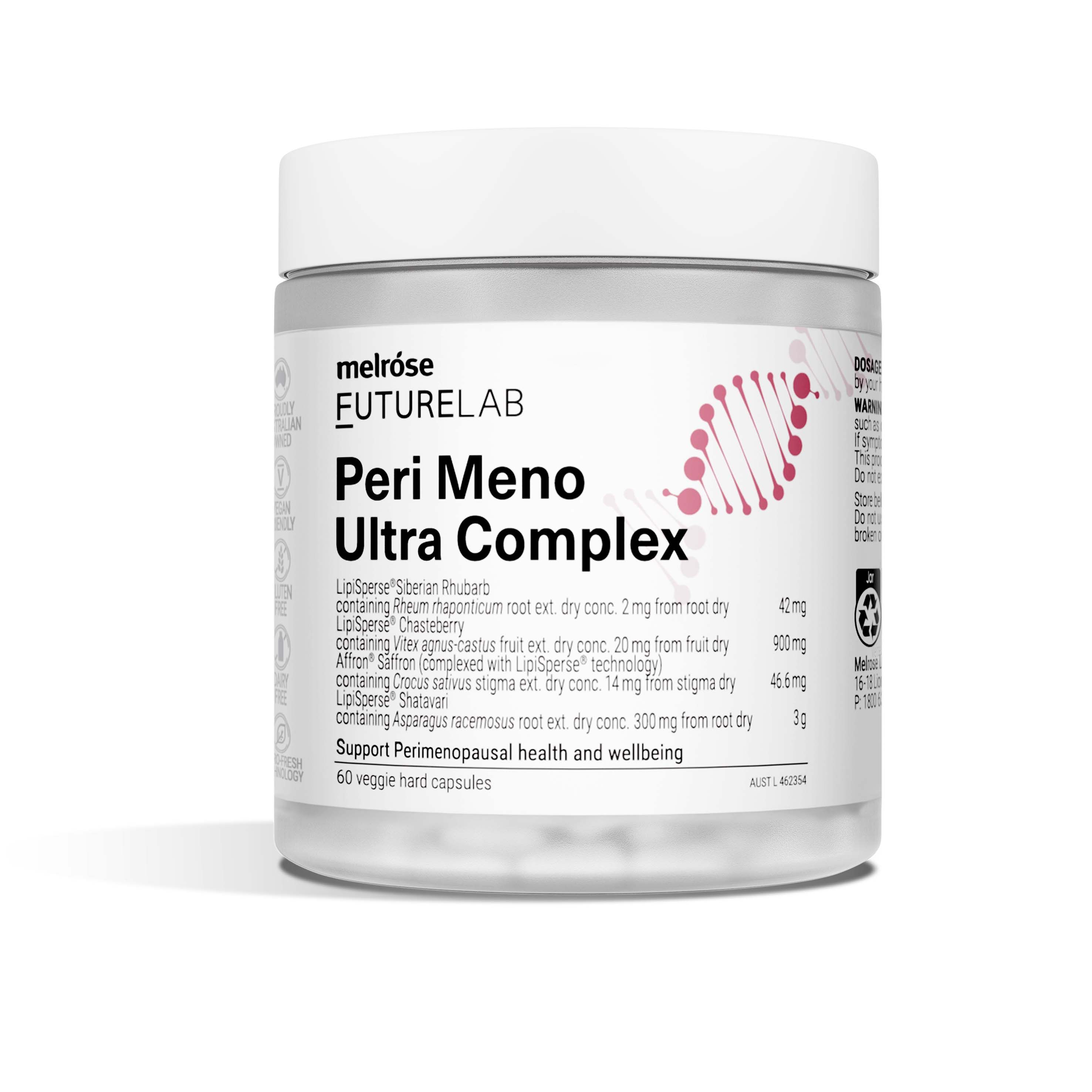 A standardised blend of four unique herbs clinically trialled to support up to 11 perimenopausal symptoms including hot flushes, restless sleep, fatigue, muscle soreness, irritability and vaginal dryness. It contains the clinically trialled Affron which has been shown to promote a healthy mood balance and reduce symptoms of mild anxiety. Our formula incorporates LipiSperse technology, an innovative and award-winning approach aimed at enhancing and optimising bioavailability within the body. Peri Meno Ultra Complex provides a natural solution to help women manage perimenopausal symptoms and maintain general health.