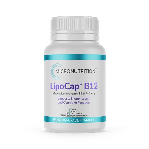 LipoCap B12 provides the bioavailable form of vitamin B12 mecobalamin to support energy production, brain and nervous system health, and red blood cell health.