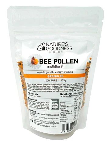 Pollen is a fine powder composed of microscopic particles that enable a plant to reproduce. It is the major food source for bees. Pollen is collected by bees from within the flower and is naturally granulated by the bees. Bee pollen is packed with nutrients, containing all the essential amino acids and fatty acids, vitamins and flavonoids. Pollen provides support to the immune system, muscle growth and energy, and stamina.