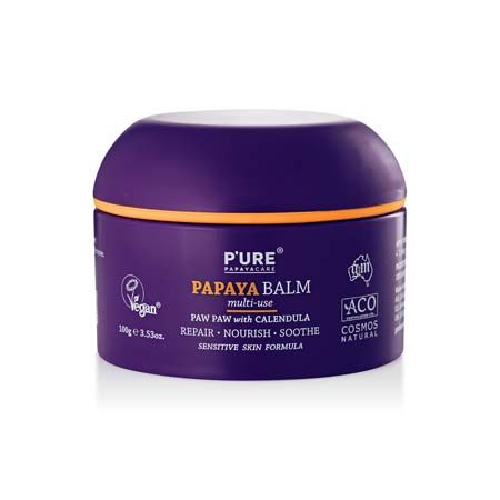 P'URE Papayacare Papaya Balm features an ultra rich nourishing & calming blend of Papaya, Shea Butter & Calendula. Papaya Balm works to repair, nourish & soothe dry, cracked & irritated skin.
