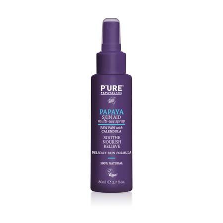 P'ure Papayacare's Skin Aid is a gentle, alcohol-free mist formulated with a nourishing blend of Papaya, Licorice Root and Calendula to soothe and nourish dry, irritated skin.