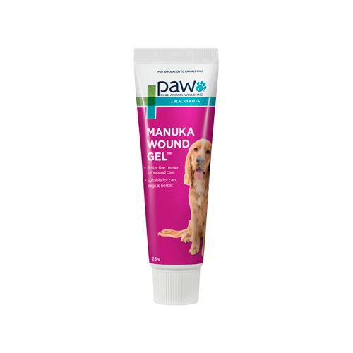 PAW Manuka Wound Gel is a sterile medical grade wound dressing made from Leptospermum.sp (Manuka) honey (80%) and natural oils and waxes for wound management. It is ideal for dogs, cats, horses and other companion animals with wounds, burns, grazes and as a general first aid.