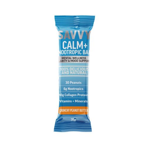 CALM+ Nootropic Bars are made with real foods, like organic peanuts, peanut butter, collagen, pea fibre, vitamins, minerals and nootropics to help with keeping you calm and mentally clear.