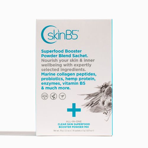 Nourish your skin & inner wellbeing with 63 powerful nutritional ingredients. Featuring marine source bioactive collagen peptides VERISOL®, prebiotics, probiotics, organic hemp protein, enzymes & vitamin B5. Clear Skin's innovative food-based approach to skin wellness uses a combination of 63 specially selected super ingredients to supply your body with key vitamins, minerals, essential fatty acids, amino acids, digestive enzymes, probiotics & prebiotics. SkinB5's unique superfood booster also features the benefits of Marine Collagen (bioactive collagen peptides VERISOL®), Australian Organic Hemp Protein, Organic Zinc (Orgen-Zn®), Maca, Probiotics Lactobacillus & Bifidobacterium, Prebiotics, Vitamins A, B5, C, D & E, Omega-3, -6 & -9, Silica, Ashwagandha, Alkalising Greens & High Antioxidant Superfruits.