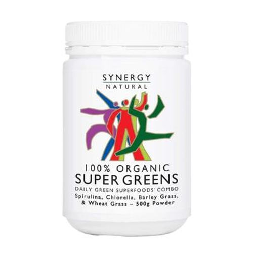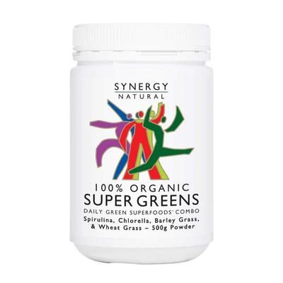 Synergy Super Greens is a synergistic blend of Nature's most nutrient dense green superfoods, Spirulina, Chlorella, Barley Grass and Wheat Grass.