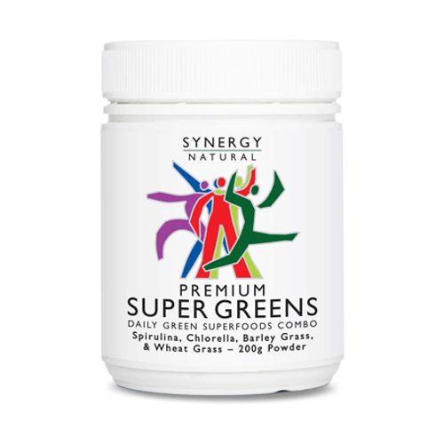 Synergy Super Greens is a synergistic blend of Nature s most nutrient dense green superfoods, Spirulina, Chlorella, Barley Grass and Wheat Grass. It provides a wide spectrum of highly bioavailable whole food nutrients, balanced by Nature and absorbed more effectively than those found in synthetic formulations. It can contribute to your 5 + daily servings of vegetables in a convenient and affordable way. When choosing a Super Greens brand, consider that meaningful amounts of a few potent ingredients may be significantly more beneficial than low amounts of a large number of ingredients. Spirulina is a microscopic freshwater plant with a high content of easily absorbed nutrients. Gram for gram, it s the most nutritious whole food known to humankind. Chlorella is also a microscopic freshwater plant that contains more chlorophyll than any other plant. It can help cleanse and detoxify the body. Barley Grass and Wheat Grass are highly alkalising green plants high in chlorophyll, fibre and a range of other important nutrients. They can help counter the over-acidity of many processed foods.