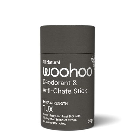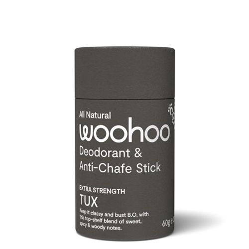 The 100% natural, 100% effective Woohoo Tux is all class. This extra strength all natural deodorant will banish body odour in style, keeping you fresh all day and into the night. The bergamot and patchouli scent is a top-shelf blend of sweet, spicy and woody notes.