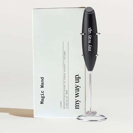 Magic Wand is a hand mixer that comes with it's own stand that will turn any protein powder into delicious creaminess and obliterates any clumps in collagen coffees.