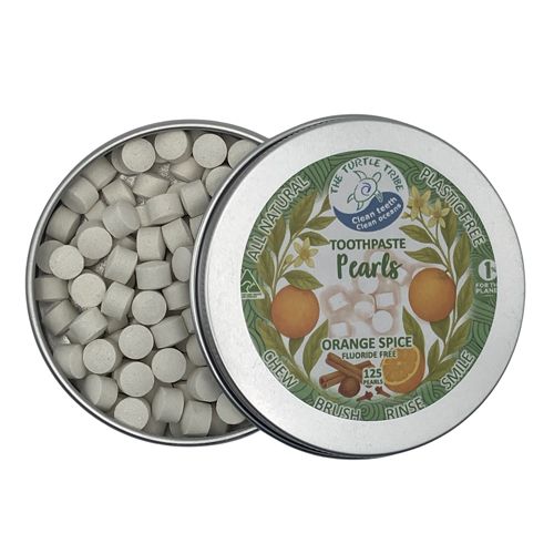 A fresh new way to brush! The Turtle Tribe Natural Toothpaste Pearls are chewable tablets that clean your teeth without the plastic waste. Just pop one in your mouth, chew, brush with a wet toothbrush, rinse, and smile.