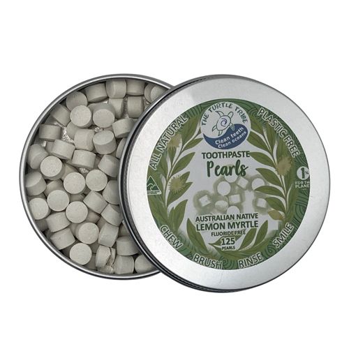 A fresh new way to brush! The Turtle Tribe Natural Toothpaste Pearls are chewable tablets that clean your teeth without the plastic waste. Just pop one in your mouth, chew, brush with a wet toothbrush, rinse, and smile.
