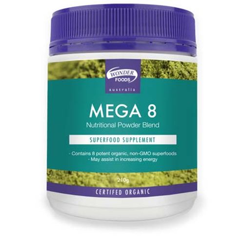 Wonderfoods Mega 8 is a power packed energy formula, consisting of 8 certified organic superfoods, to help give you the boost that you need! Mega 8 powder is packed with 8 non-GMO, certified organic superfoods, that provides an all-natural, nutrient dense boost. This formula contains a range of superfoods including, raw cacao, goji berry, spirulina, green barley grass, acai berry, moringa leaf, camu camu and chlorella. These provide antioxidants, carotenoids, polyphenols, amino acids, vitamins, minerals, soluble and insoluble fibre.