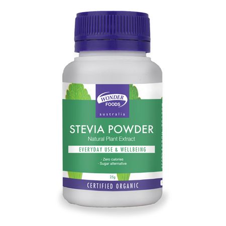 If you have a sweet-tooth and are passionate about your health, add this organic Stevia powder for a low-calorie natural sweetener. Wonderfoods stevia is a water based extract from organic stevia and is a natural alternative to sugar, is chemical free with no added nasties! Stevia (Steviol Glycosides) is derived from the leaves of the stevia Rebaudiana plant, making this all natural supplement a great healthy choice. It is naturally very sweet and considered 100 to 300 times sweeter than sugar, contains not calories and does not produce a glycaemic response like sugar does, making it an excellent choice for those limiting their sugar intake.